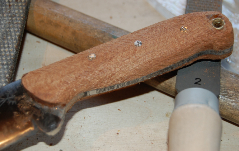 Wykonując rękojeść do noża z pełnym trzpieniem zaczynamy od narysowania okładek na twardym kartoniku. W tym celu przykładamy rękojeść przyszłego noża do twardej tektury i odrysowujemy kształt rękojeści. Następnie kształt ten przenosimy na deskę i wycinamy. Gdy mamy już gotowe okładki zaczynamy ich obróbkę. Wiercimy otwory i szlifujemy krawędzie tak aby nic nas nie uwierało w trakcie trzymania. Następnie docinamy odpowiedniej długości nity z drutu mosiężnego (nit musi być o 2 mm dłuższy niż grubość rękojeści i ostrza). Gdy wszystko jest gotowe przyklejamy okładki rękojeści do ostrza dwuskładnikowym klejem epoksydowym i od razu nitujemy je. Do wyschnięcia kleju pozostawiamy rękojeść ściśniętą np. ściskami stolarskimi. Po wyschnięciu kleju zaczynamy ostateczną obróbkę i wygładzanie powierzchni papierem ściernym. Jeszcze tylko impregnacja i nóż jest gotowy.