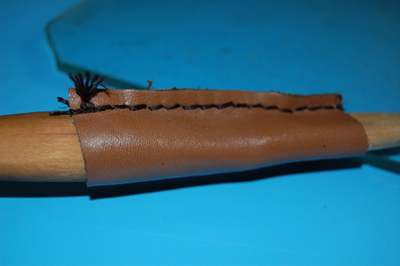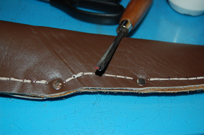Gdy wszystko jest już gotowe zabieramy się za zszywanie naszej pochwy. Aby szew był równy odznaczamy sobie miejsca otworów widelcem, teraz możemy robić otwory szydłem w równych odstępach. Linię szwu można zaznaczyć wycinając w skórze rowek na nitkę przy użyciu trójkątnego dłuta do rzeźbienia. Jeśli jednak nie posiadamy takiego dłuta nie należy się tym przejmować i szyć bez rowka. Nić przed szyciem należy dokładnie nawoskować, co ułatwi nam przeciąganie jej przez ciasne otwory w skórze. Szwy wykonujemy zawsze na tak zwane dwie igły.