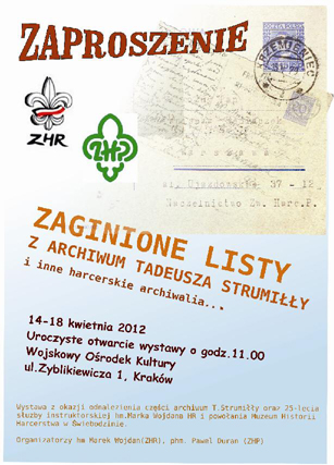 Zdobywająca imię hm. RP Stanisława Sedlaczka, 25 Harcerska Drużyna Pożarnicza przy OSP Kostrze, serdecznie zaprasza na wystawę "Zagubione listy z archiwum Tadeusza Strumiłły i inne harcerskie archiwalia...". Otwarciu wystawy towarzyszyć będzie harcerska sesja historyczna "Stanisław Sedlaczek w świetle nieznanych listów i dokumentów".